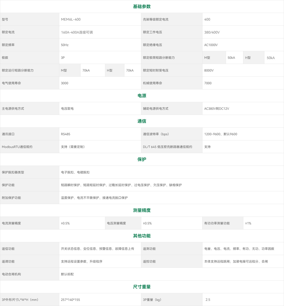 MEM6LE系列剩余电流动作断路器(以下简称断路器),是本公司采用国际先进设计和制造技术研制开发的新型断路器。可以面向分布式光伏应用场景或者JP柜应用场景,安装在AC220/380V配电网并网点实现配电安全生产应用的,具备过载长延时反时限、短路短延时反时限、短路短延时定时限、短路瞬时、欠电压保护,被动孤岛保护,剩余的电流保护,电气量的采集测量、告警、状态监测、统计,支持与台区智能融合终端信息交互,并可接收相关控制指令实现分合闸操作,具备对光伏并网点的常规电气保护以及光伏并网专用保护等主要功能的专用低压断路器。